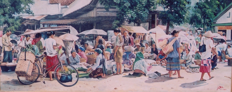 Pasar tradisional merupakan tempat bertemunya penjual dan pembeli serta ditandai dengan adanya transaksi penjual pembeli secara langsung dan biasanya ada proses tawar-menawar bangunan biasanya terdiri dari kios-kios atau gerai los dan dasaran terbuka yang dibuka oleh penjual maupun suatu pengelola pasar. Teknik penggarapan lukisan bertema pasar ini menggunakan teknik realis impressionis. Lukisan satu ini lengkap dengan bingkai tipis berbahan kayu.